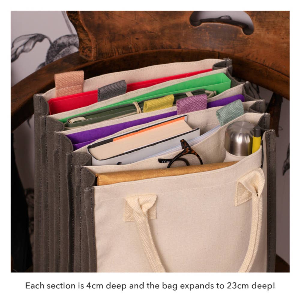 Just ONE 'tote-ally' organized bag with ONE set of sturdy handles and FIVE generously sized tabbed sections. Room for all your papery stuff in one very perfectly portable bag. A brilliant gift for teachers, students, hobbyists or people with just lots going on!